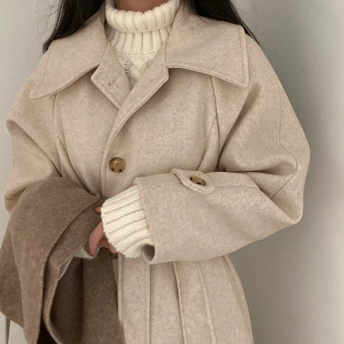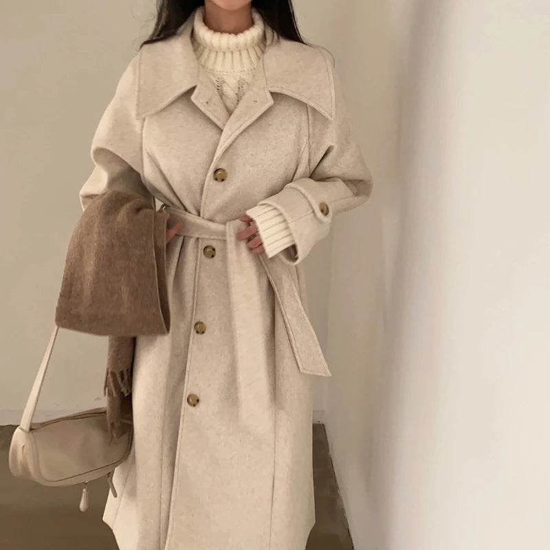Women Wool Long Wrap Coat 2025 Elegant Turn-Down Collar Single Breasted Belted Warm Double Faced Woolen Winter Overcoat